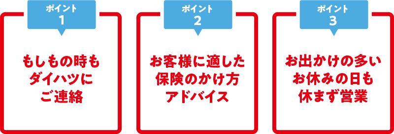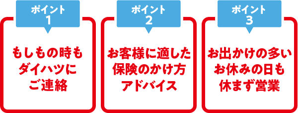 おクルマをご購入いただいた場合、遅くとも納車日までに自動車保険のお手続きが必要です。 室蘭ダイハツは、自動車保険にご加入いただいたお客様に確かな安心をご提供します。
